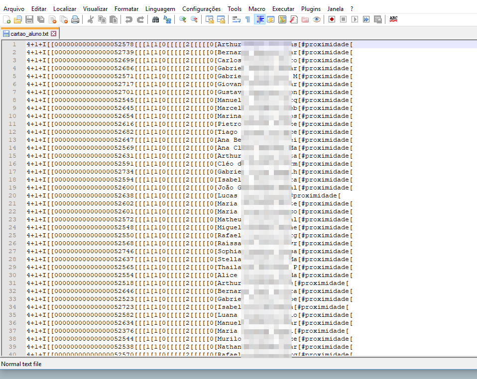 Cada link fornece um arquivo txt com a relação completa dos cartões existentes, com os associados mais recentes primeiro. Para evitar a demora no envio para as catracas, é possível abrir o arquivo em um editor de texto como o Notepad ou o Notepad++ (gratuito) e deixar apenas as linhas mais recentes, a partir do primeiro cartão que tenha sido associado no passo anterior. A figura abaixo mostra um exemplo de arquivo de alunos.